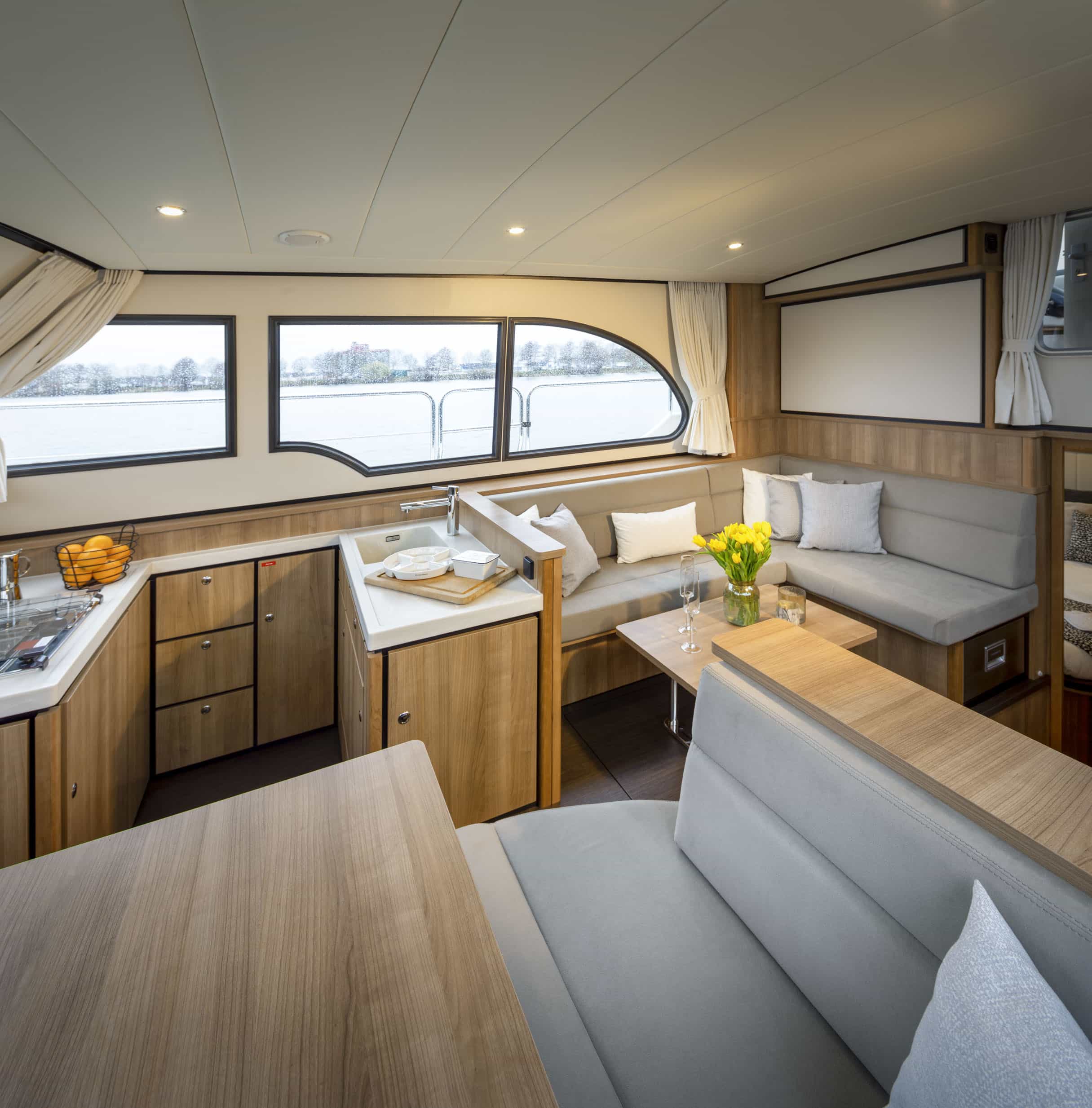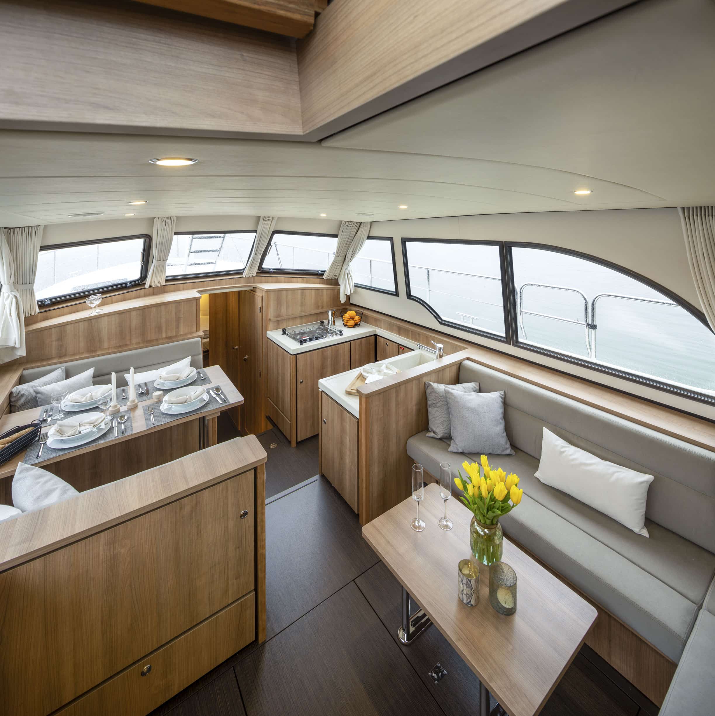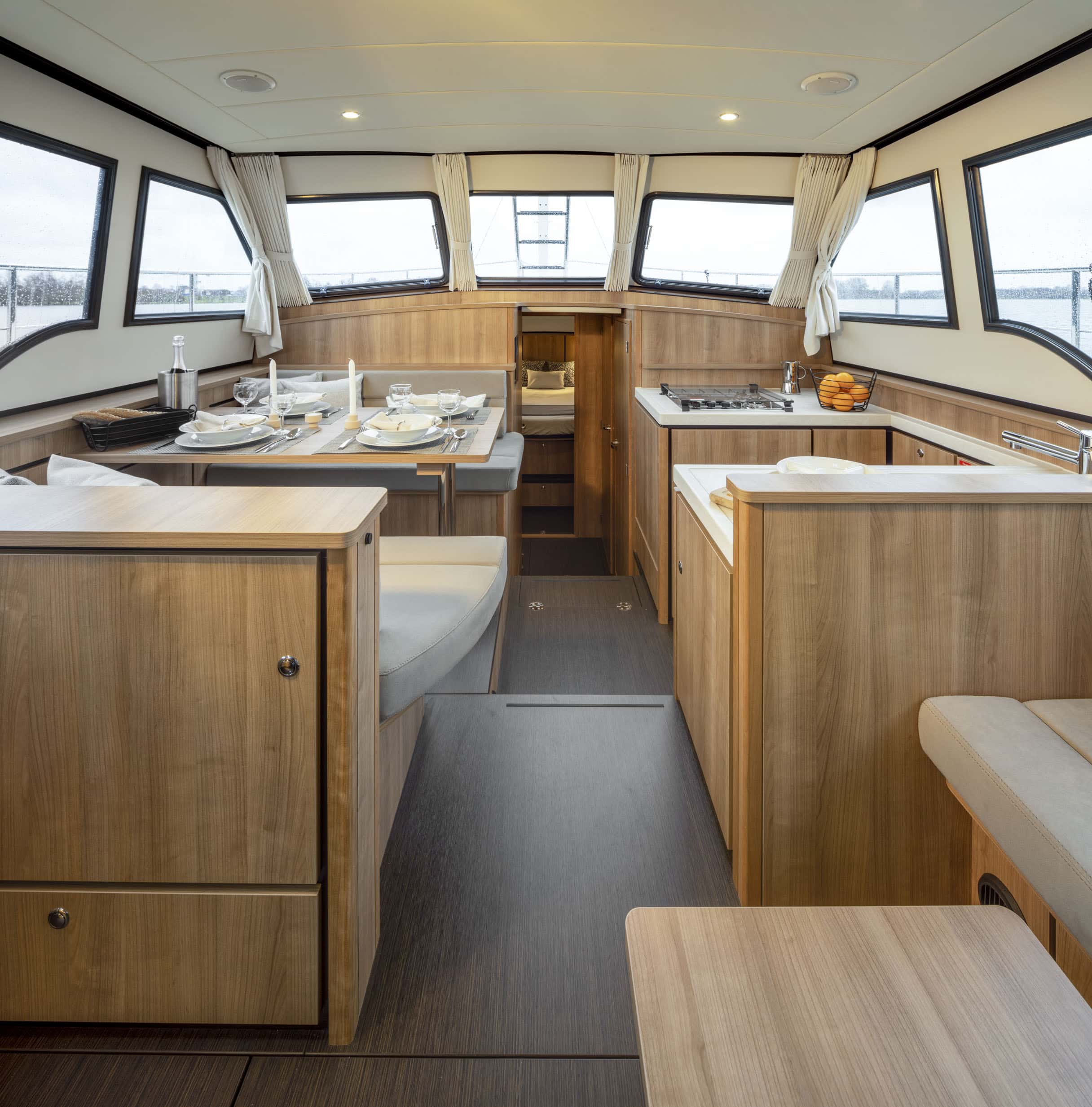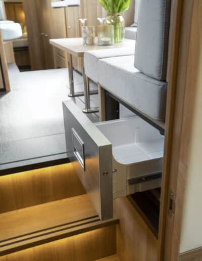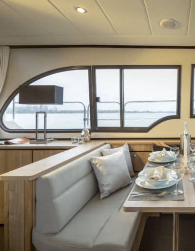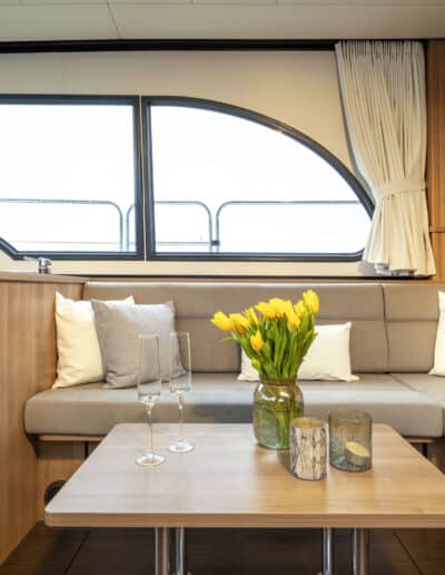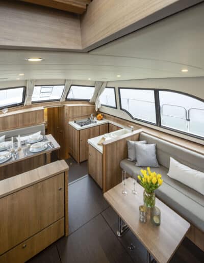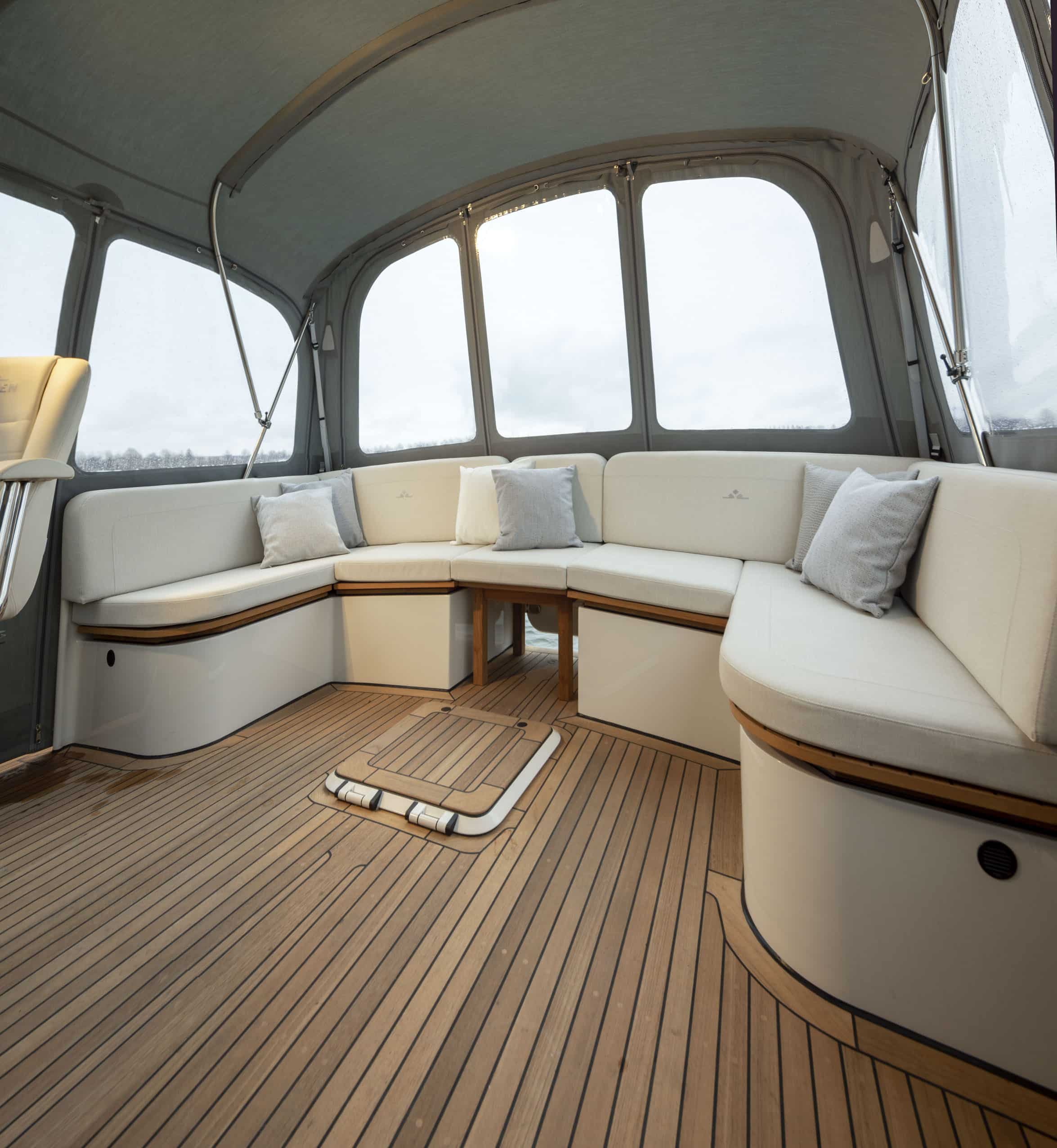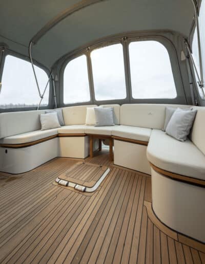An Deck gibt es einen geräumigen Sitzbereich mit bequemen Kissen und einem Esstisch aus Teakholz. Das Achterdeck kann rund um die Bank komplett geschlossen werden. Das Achterdeck kann beheizt werden, sodass Sie bequem im Freien sitzen können.