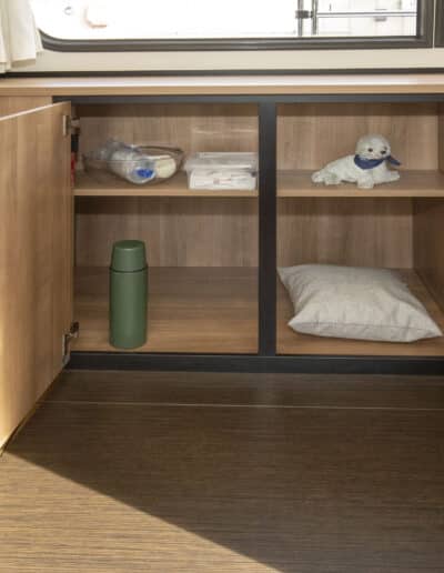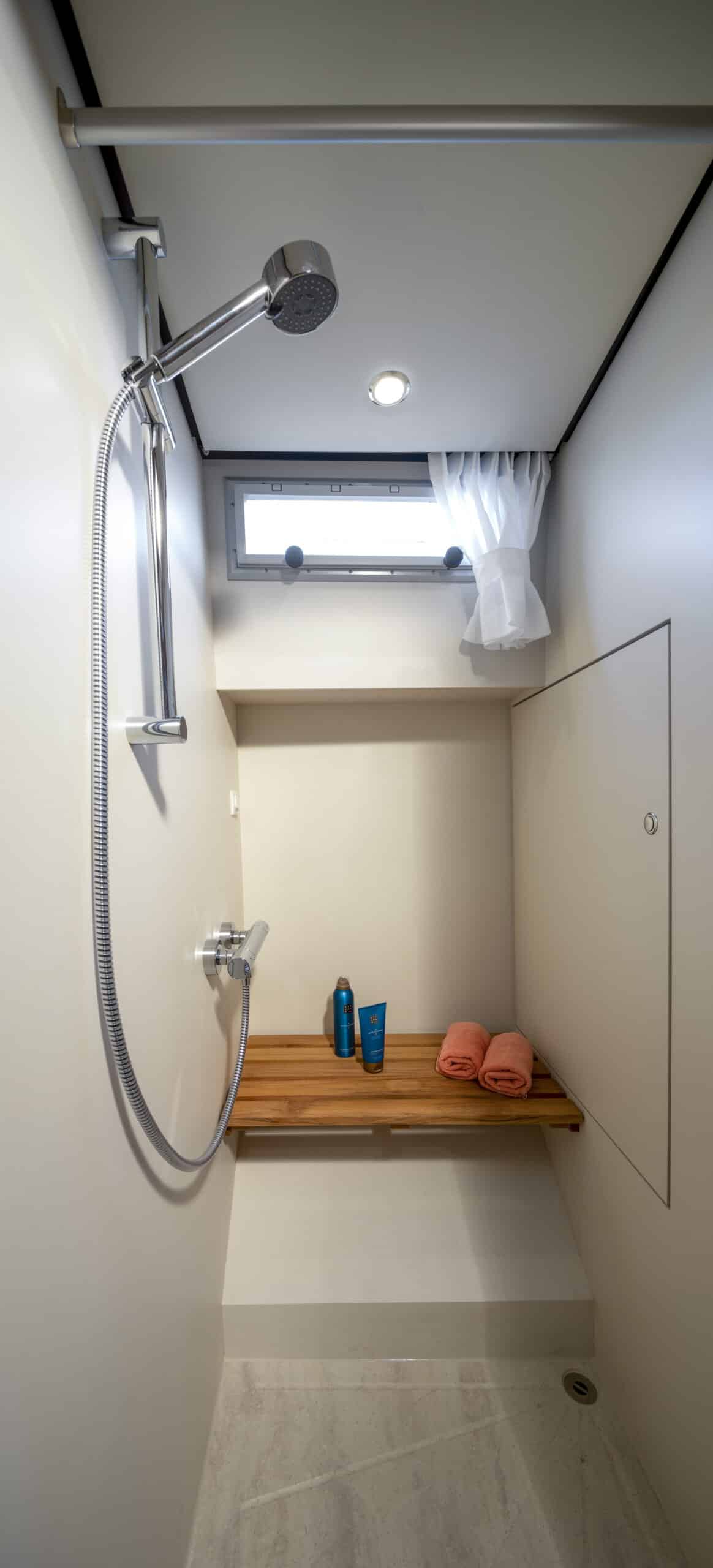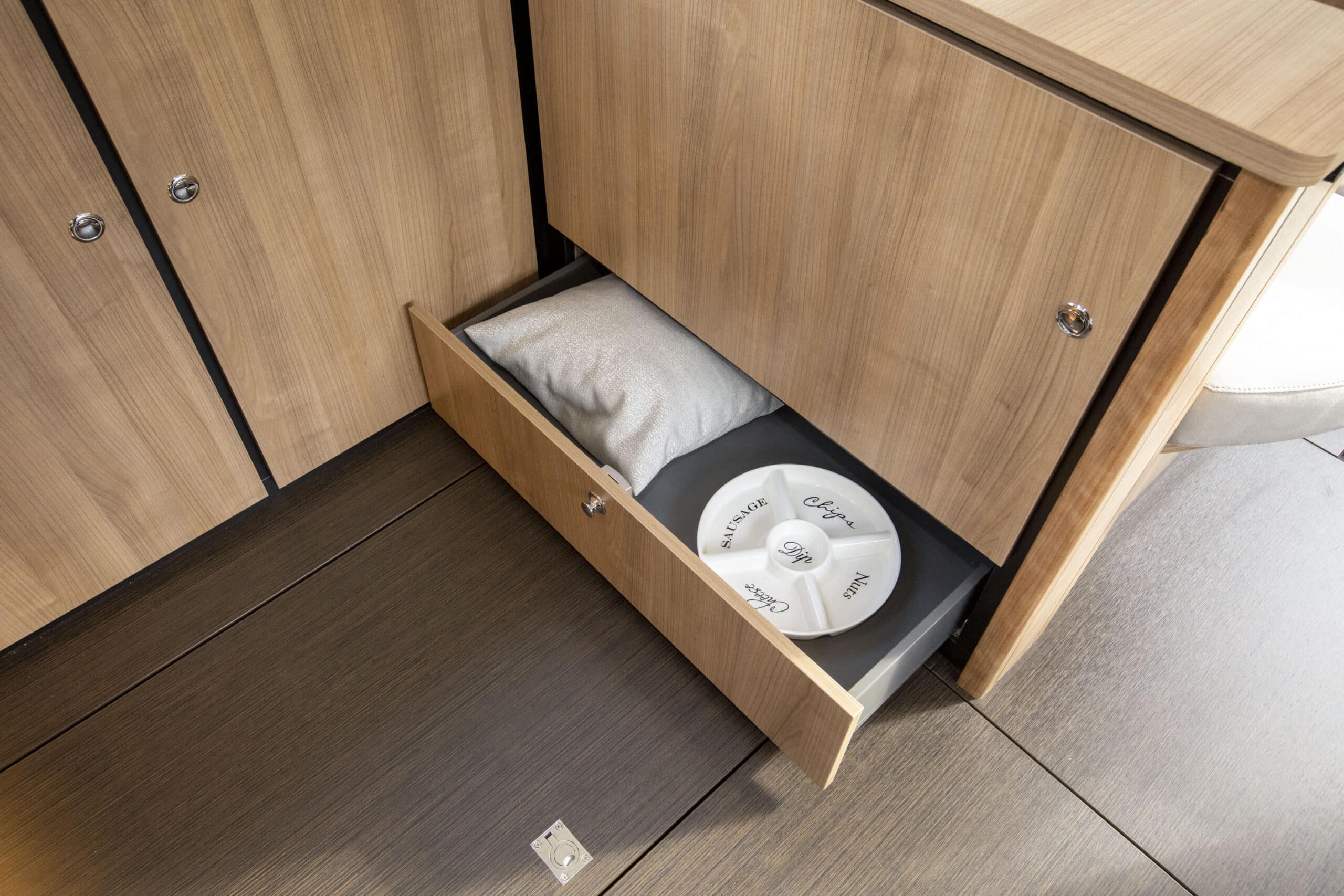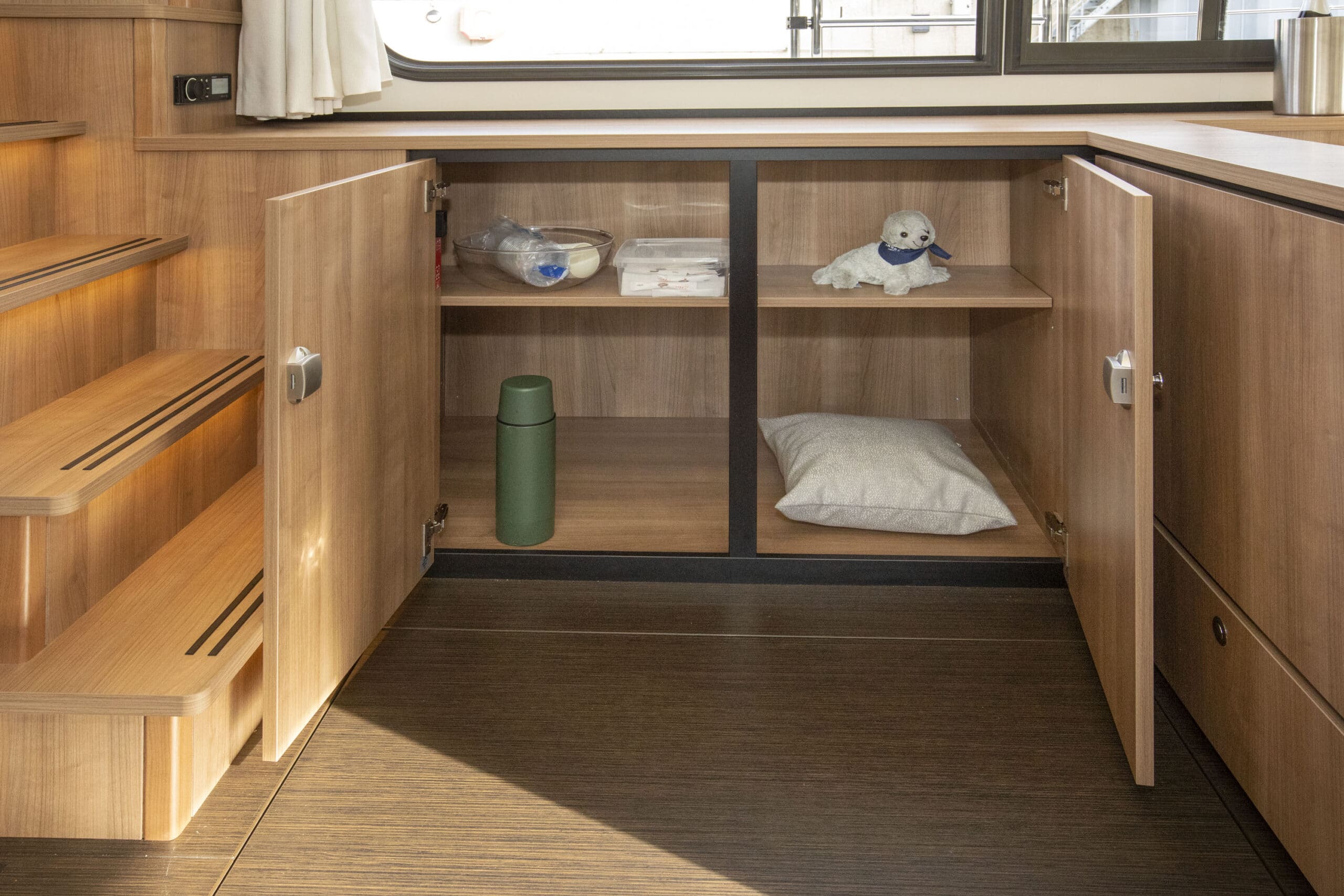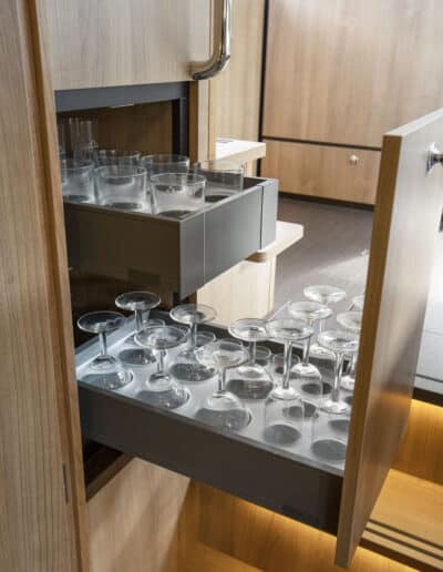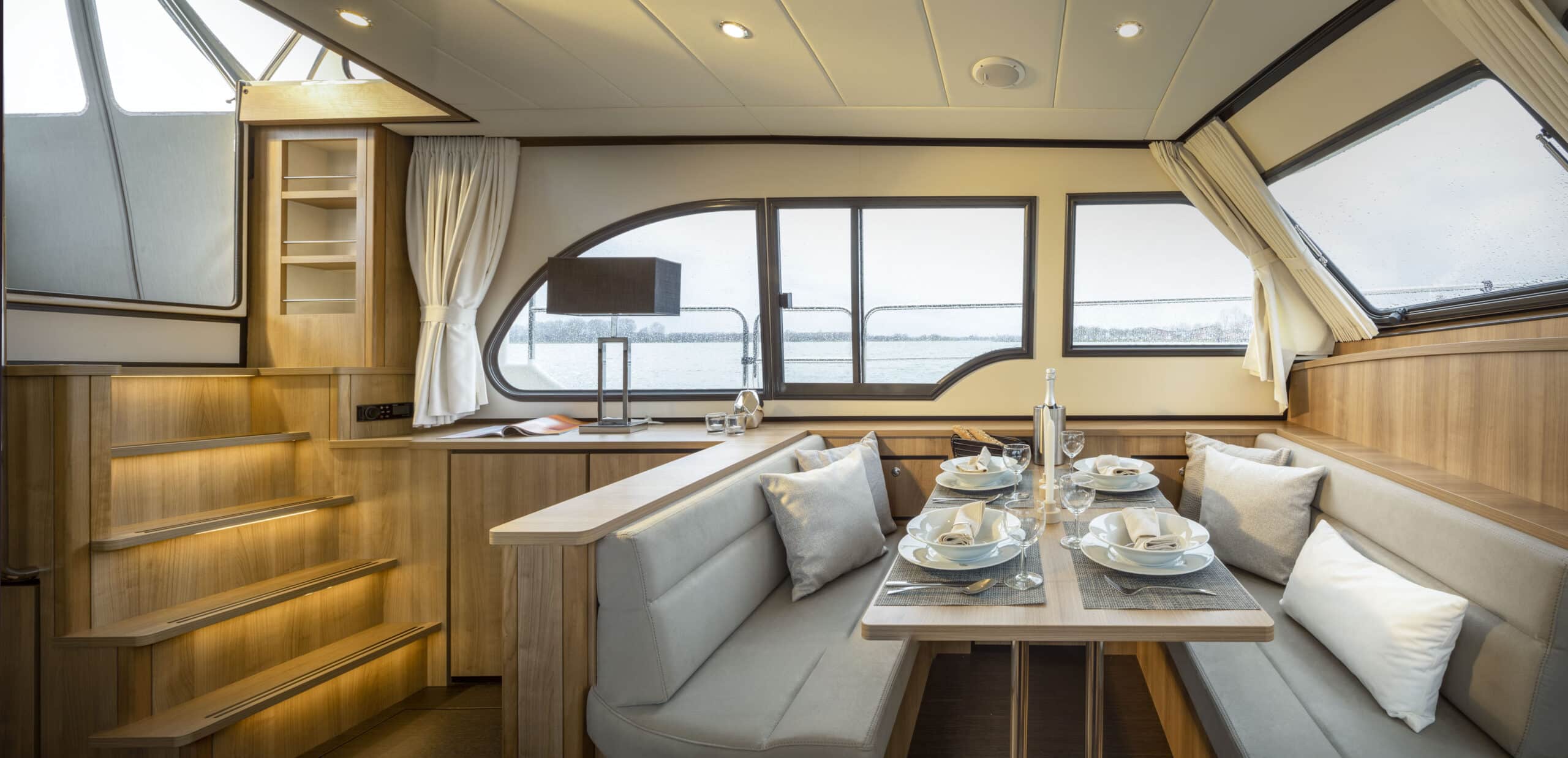 An Deck gibt es einen geräumigen Sitzbereich mit bequemen Kissen und einem Esstisch aus Teakholz. Das Achterdeck kann rund um die Bank komplett geschlossen werden. Das Achterdeck kann beheizt werden, sodass Sie bequem im Freien sitzen können.