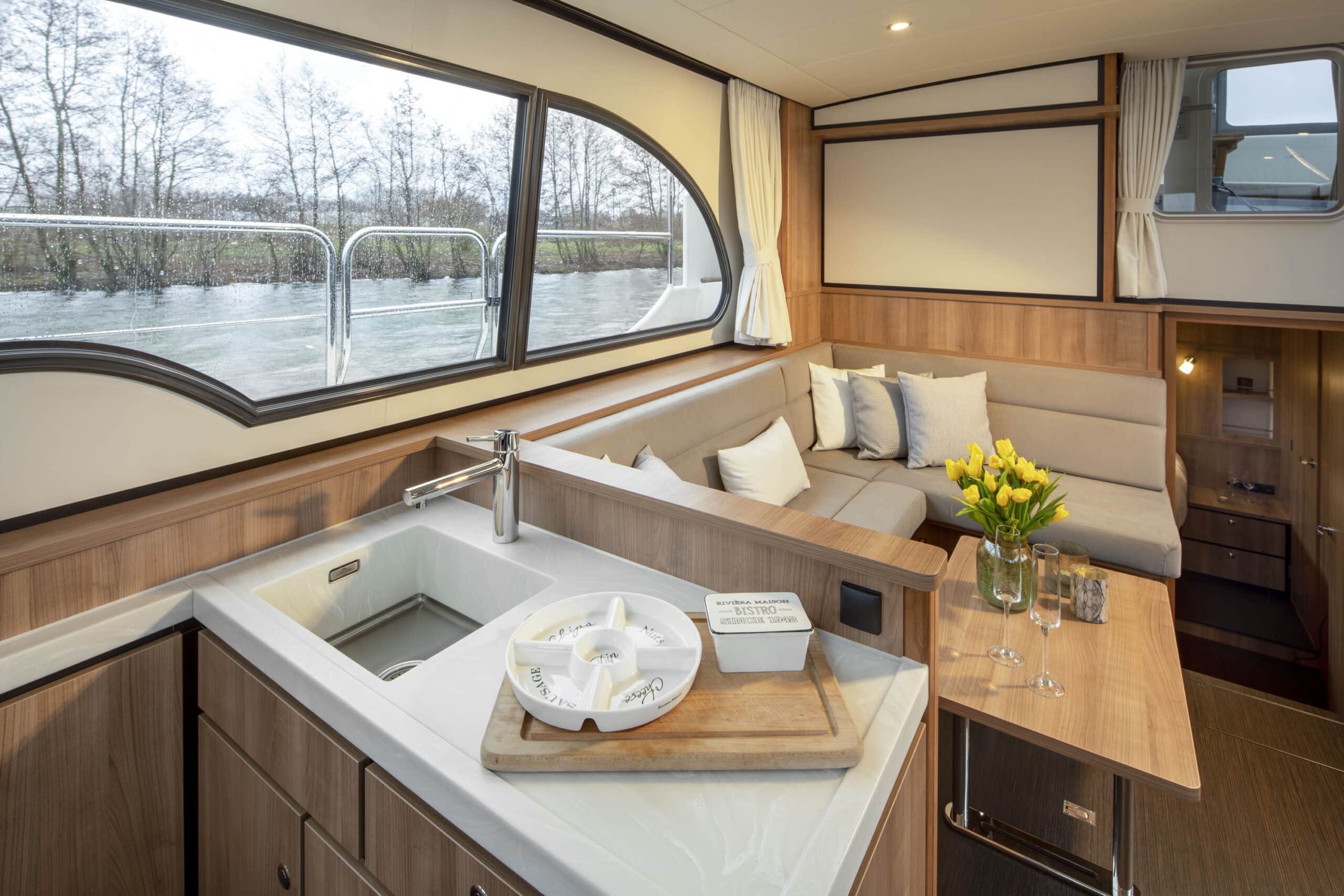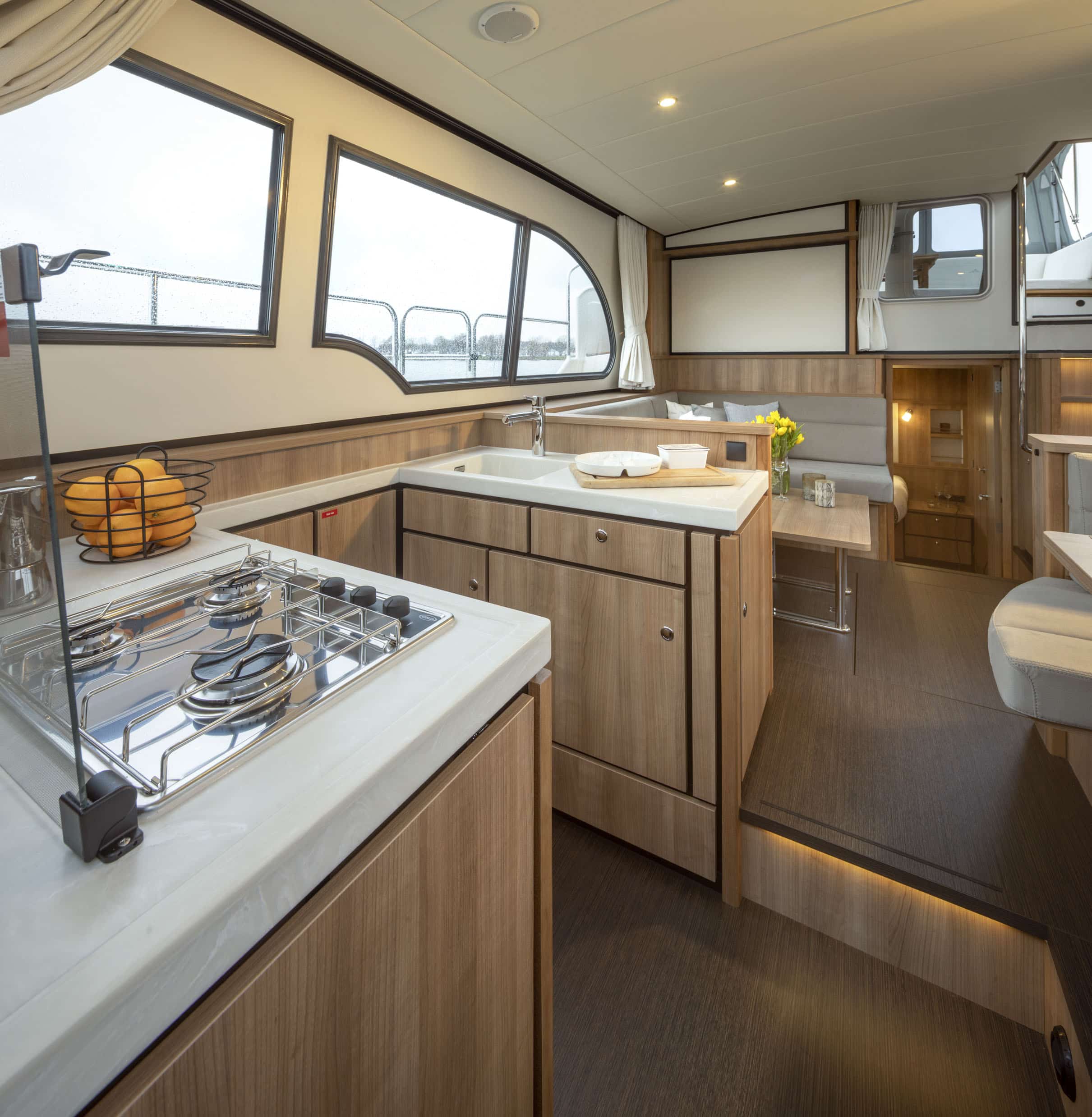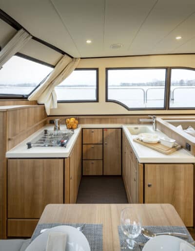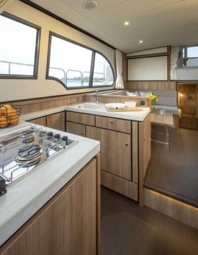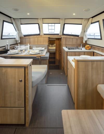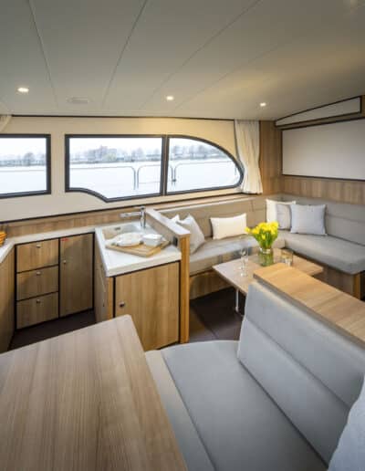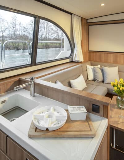 Der Salon ist sehr geräumig und hell und bietet reichlich Platz für sechs Personen. Hier befindet sich auch die voll ausgestattete Küche. Ein Fernseher und eine Nespresso-Kaffeemaschine sind vorhanden.