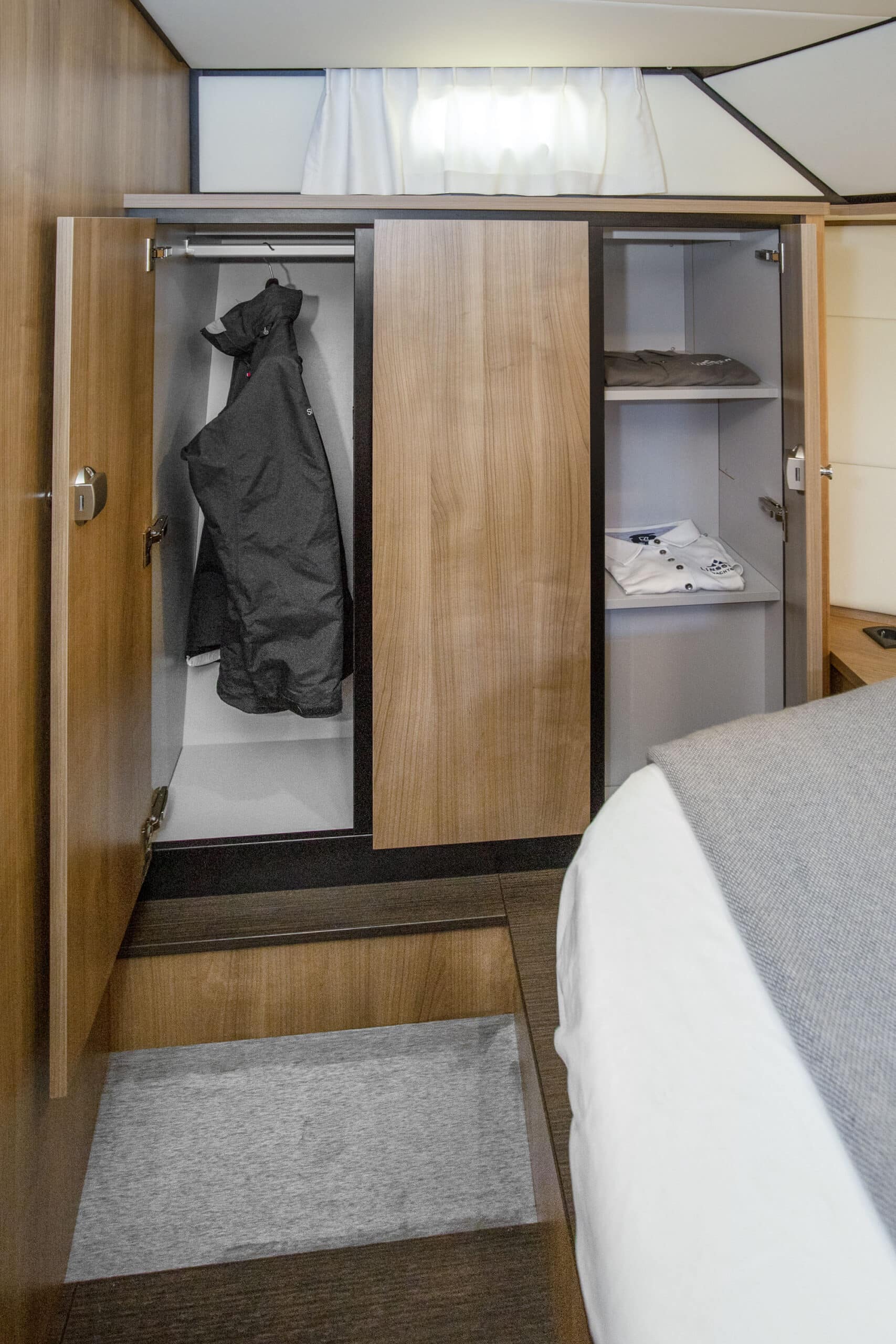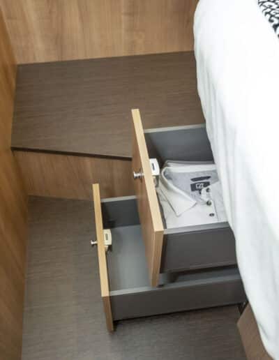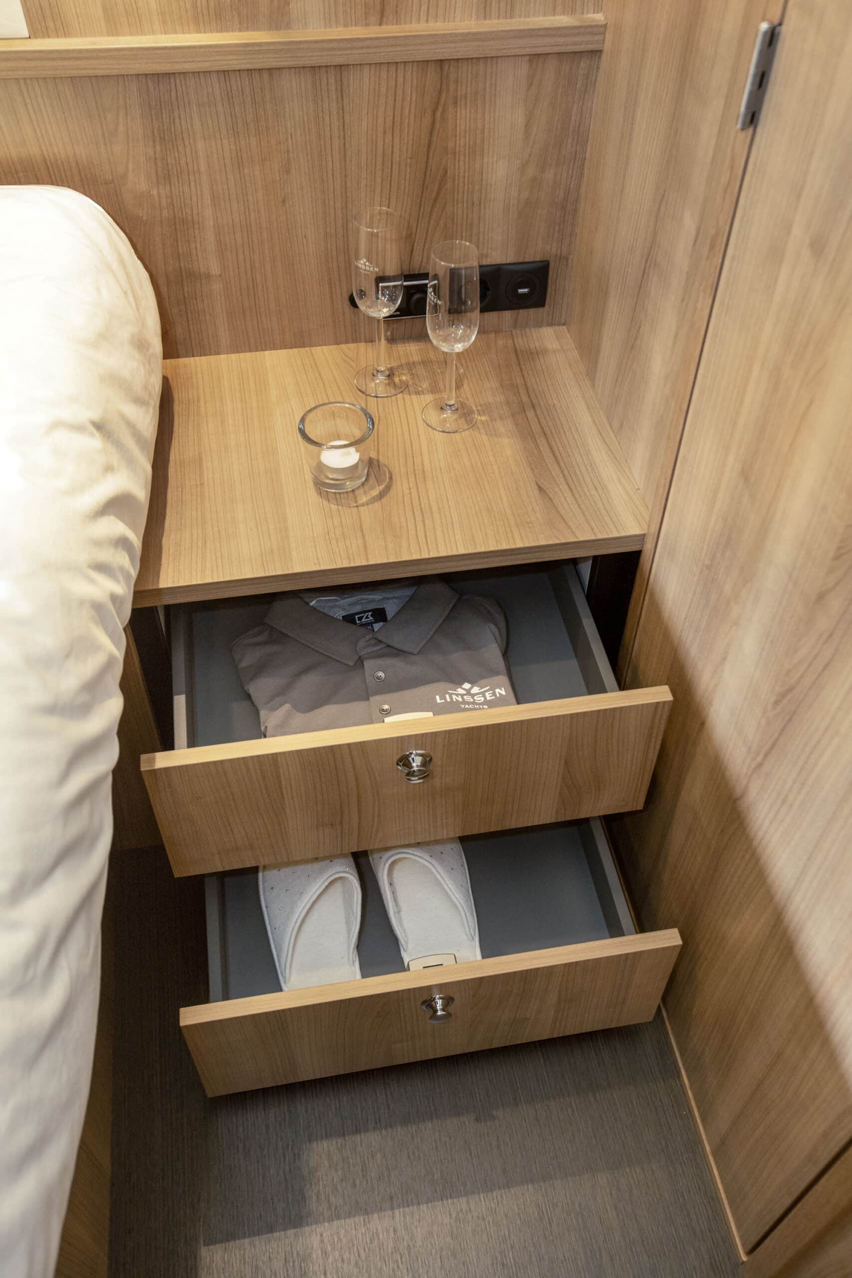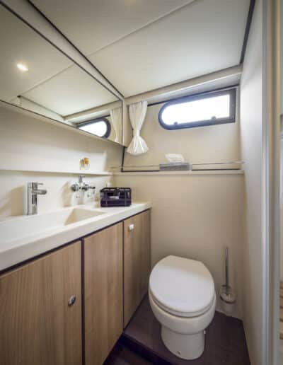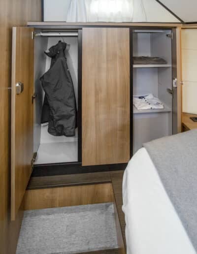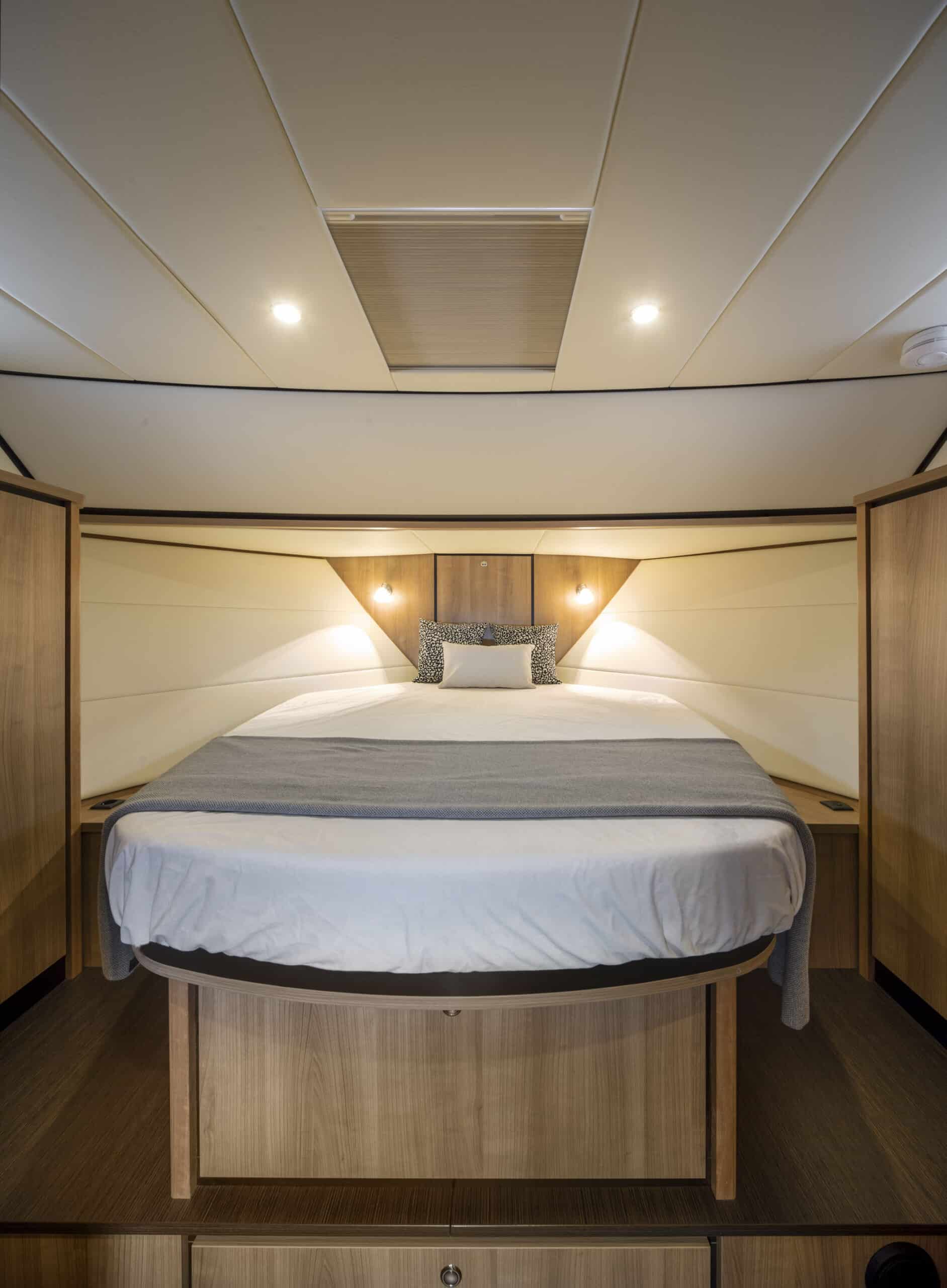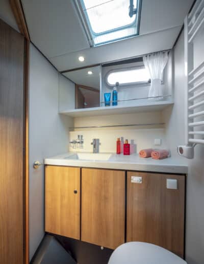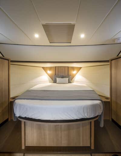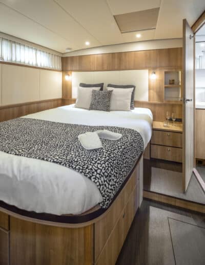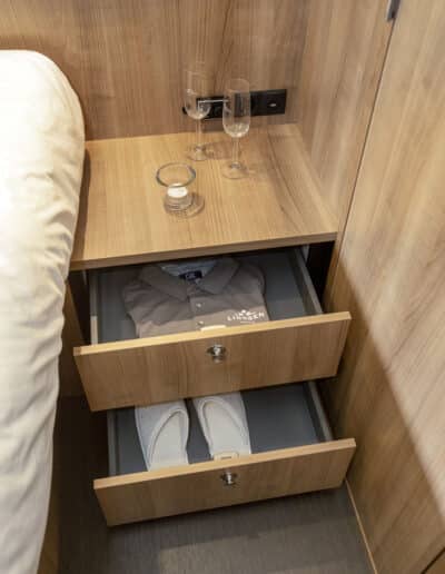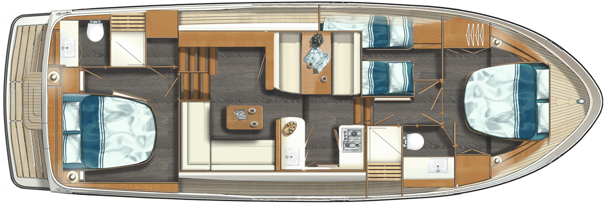 Die Linssen Motoryacht 40.0 SL AC ist eine großzügig geschnittene Yacht mit zwei identischen Kabinen, jeweils mit einem Doppelbett, zwei Badezimmern und zwei elektrischen Toiletten. Darüber hinaus verfügt dieser Yachttyp über eine geräumige dritte Kabine mit zwei Einzelbetten und viel Stauraum.